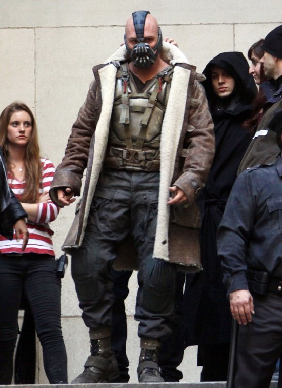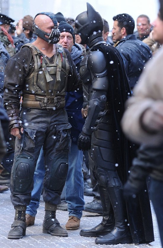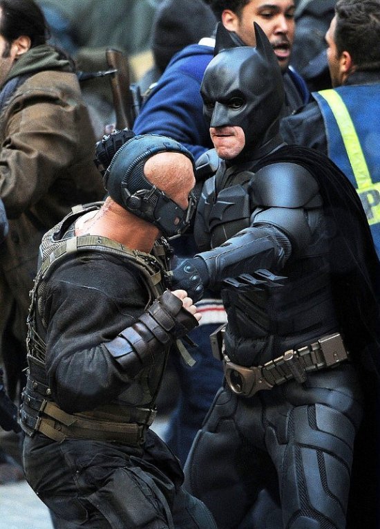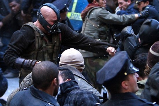 Кристиан Бейл и Том Харди снова устроили драку на улицах Нью-Йорка. Вернее, сражались Бэтмен и Бэйн, а также полицейские Готэма. Еще на минувших выходных была замечена дублерша Женщины-Кошки, катающаяся на бэтподе, и Мэтью Модайн в роли стража порядка, которому сильно досталось от супергероев.