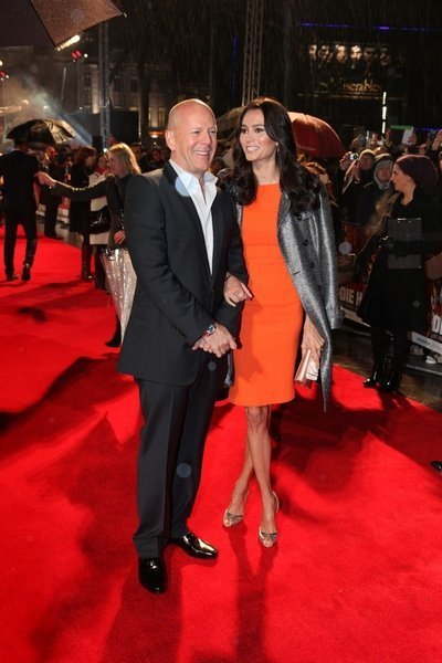 Лондон встретил гостей традиционным дождем и холодом, так что поначалу артисты разгуливали по красной дорожке в пальто. Но работа есть работа — и пальто пришлось снять. Прибыли звезды, к слову, в больших «хаммерах» в сопровождении мотоциклетной группы девушек — похожая сцена есть в фильме. Брюс был в компании жены Эммы и обнимал ее так же нежно, как и в Берлине — но обошелся без показушных поцелуев.
