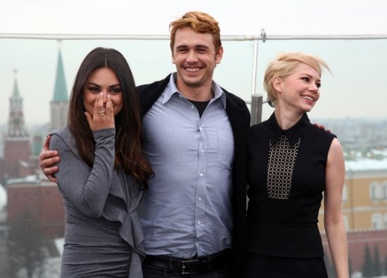 Попозировав фотографам, звезды спустились вниз в зал пресс-конференции. Там случился небольшая накладка: не сразу заработали устройства синхронного перевода. Джеймс Франко, и так-то спавший, тут же бросил попытки что-то понимать и снял наушник. Мила Кунис взяла на себя роль переводчика, и пока технические трудности не были решены, переводила вопросы своим американским коллегам.