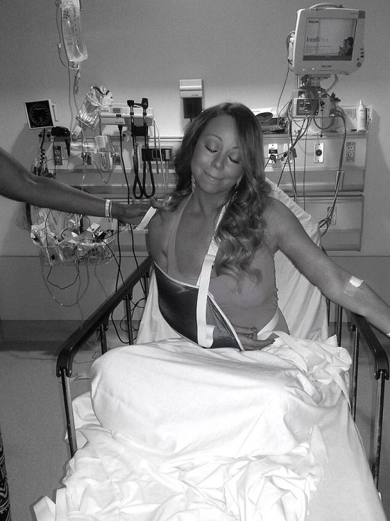Мэрайя, однако, во всем видит положительную сторону и смеется, что у нее есть теперь модная примочка-ремешок на пару недель. Она выложила в Твиттере собственную больничную фотографию — сидит себе в позе лотоса на больничной койке и расслабленно улыбается. Молодец!-)