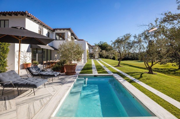 Особняк площадью 12 000 квадратных футов включает в себя шесть спален и девять ванных комнат, большой бассейн, открытый внутренний двор, две гостиные, столовую и кухню шеф-повара.