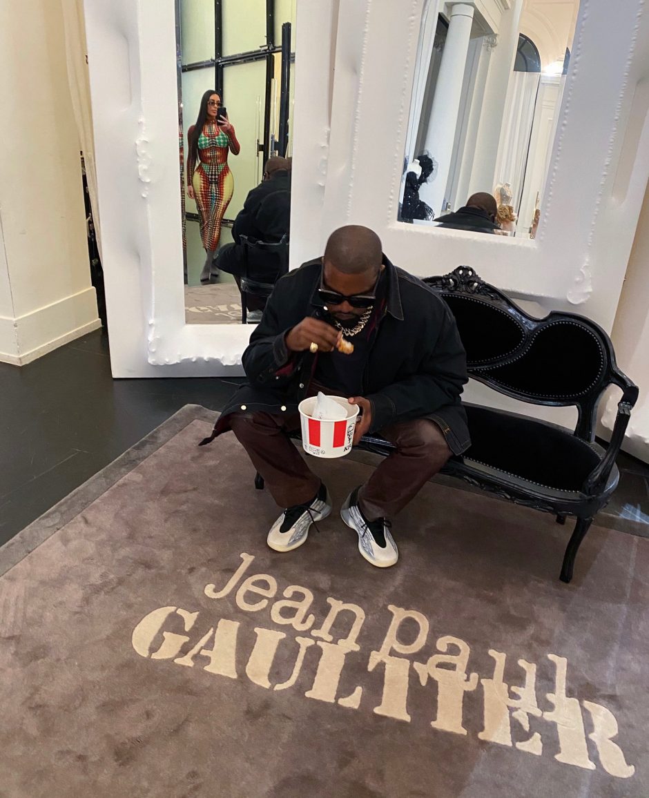 Ким Кардашьян и Канье Уэст находятся в Париже, посещая элитные дизайнерские дома. Пока Ким занималась модным вопросом, Джей-Зи проголодался. Слава богу, поблизости был киоск, где он мог заказать ведерко с жареной курицей из Кентукки. 39-летняя Ким Кардашьян поделилась зеркальной селфи, показывающей пару в ателье Jean Paul Gaultier 19 февраля. Ее можно было увидеть в обтягивающем ярком платье от дизайнера на переднем плане, в то время как Канье Уэст сидел на диване и поглощал свою еду из KFC на переднем плане.