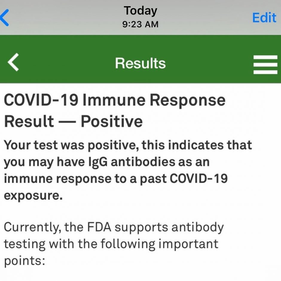 «Я ПОЛОЖИТЕЛЬНА в отношении антител к covid», — поделилась она, опубликовав снимок экрана с результатами своих последних тестов. «У меня был Covid-19».