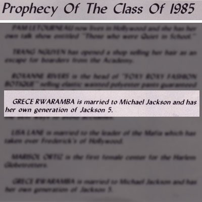 Недавние открытия, сделанные репортерами портала TMZ, подозрения Ла Тойи способны только укрепить. Они раздобыли выпускной альбом Грейс, которая в 1985 году окончила Академию Святого Семейства в Коннектикуте, и обнаружили в нем немало интересного. Оказывается, Майкл Джексон был кумиром Грейс с самого ее детства, и он упоминается в альбоме четырежды. Во-первых, в анкете в графе «Что любит» Грейс написала имя Майкла первым, а затем уже «вспомнила» свою собственную семью. Во-вторых, в нем присутствует фото Грейс с подписью: «Майкл Джексон, умри от зависти!» (или «Майкл Джексон отдыхает»). Кроме того, альбом содержит фразы «Грейс Рварамба замужем за Майклом Джексоном и у нее есть свое поколение Джексон 5» (это в прогнозах на будущее) и «Грейс оставляет все свои фотографии Майкла Джексона, открытки, футболки, записи и перчатку Сестре Патрик (ее старосте опочивальни) и Тони Барбосе (ее младшей сестре) с надеждой, что они научатся любить его» (это в разделе «Завещания»).