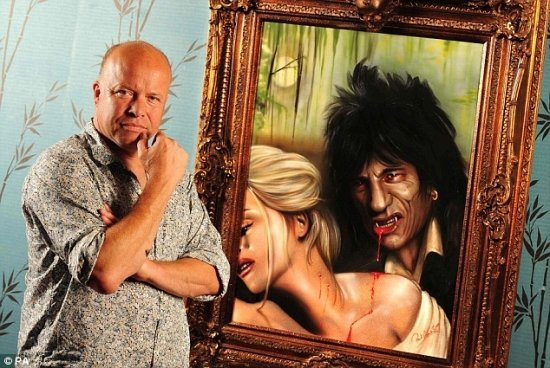 Вот в таком презамечательном образе – вампира, впивающегося в нежную шейку прекрасной блондинки — гитариста «Роллинг Стоунз» Ронни Вуда изобразил его шурин — художник Пол Карслейк. Неспроста, разумеется: Пол (слева на фото)убежден, что за тридцать лет совместной жизни Ронни выпил немало кровушки его любимой старшей сестры Джо. Но до тех пор, пока в жизни Вуда не появилась разрушительница семейного очага русская официантка Катя Иванова, брат его законной супруги свое недовольство зятем в творчестве не выражал. Роман Ронни с Катериной стал последней каплей, и Пол взялся за кисти и краски, а для пущей убедительности порезал руку скальпелем и побрызгал картину собственной красненькой. Отомстил, словом!