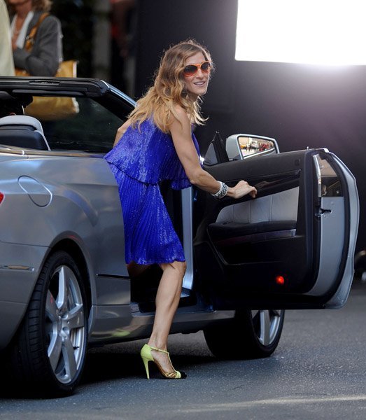 Вчера снимались сцены на 5й Авеню. Счастливые Кэрри и Мистер Биг вернулись домой, полагаю из свадебного путешествия — так как показывали друг другу колечки и вели как новобрачные. Затем Кэри Брэдшоууже в другом наряде совершила свою фирменную пробежку на золотых шпильках Christian Louboutin Pigalle за три тысячи долларов. Финалом стали съемки того, как Кэрри впервые приезжает в Нью-Йорк в 80-х — для этого Сару Джессику загримировали под молодую героиню, сделав ей ужасную кудрявую причесочку. Лучше бы наняли действительно молодую актрису…