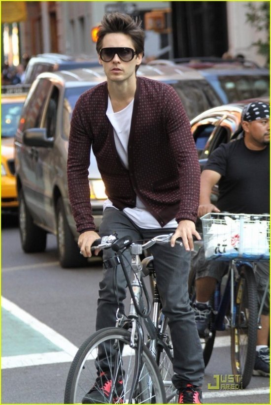 Обычно Джаред Лето предпочитает передвигаться на мотоцикле, но иной раз, как видите, предпочитает не давить на педали, а крутить их собственноножно. Папарацци засняли актера и музыканта, когда он на своем велосипеде катался по делам в нью-йоркском районе Сохо. Давайте и мы поглядим, как он это делал.