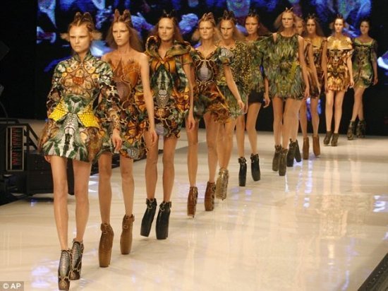 Мода и «Происхождение видов» Чарльза Дарвина… Какая связь? Британский дизайнер Александр МакКуинн ее нашел: представляя в Париже свою новую коллекцию, он заявил, что вдохновлялся именно этим трудом знаменитого естествоиспытателя. Не знаю-не знаю, если бы в ходе эволюции , скажем, у человека появились бы такие ступни, вымерли бы мы как динозавры, как пить дать! На этих ходулях, имхо, не то что ходить, а и стоять проблематично. Про бегать лучше промолчу — даже самый медлительный хищник догнал бы! Тем не менее, алесандровы модели как-то на этих шпильках держатся. С другой стороны, за ними же не гонится какой-нибудь тиранозавр рекс.