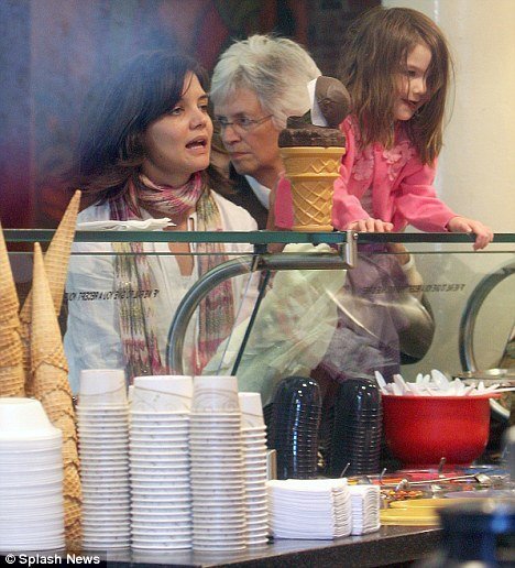 Дети, конечно, не идеальны и порой весьма капризны, особенно, если им не дают того, чего им хочется. Сури Круз — не исключение. Пока папа Том Круз снимался в Бостоне в своем новом фильме «Уичита«, мама Кэти Холмс и бабушка Кэтрин (по материнской линии) повели кроху погулять по городу, и имели неосторожность заглянуть в кафе-мороженое. Кэти выбрала там, судя по картинкам, шоколодный холодный десерт, но Сури, видимо, хотелось вкуса поразнообразнее, так что она перегнулась через стеклянный прилавок и ткнула пальчиком в то, что милее ее трехлетнему желудку. Хулиганка растет! Но, что самое удивительное, никто даже и не пытался ее остановить.