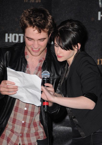 Поскольку встреча как бы неформальная, актеры появились на сцене практически в повседневной одежде. Роберт Паттинсон вообще вышел в кожанке и расхристанной рубашке,а уж что творилось на его голове — я вообще промолчу )) «Прежде всего, спасибо вам, ребята, — обратился он к фанатам. — Без вас «Сумерек» бы не было, так что спасибо вам большое».