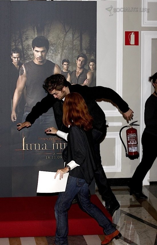 Как ни пытался Роберт Паттинсон сбежать ото всех в аэропорту, а все же пришлось лететь в Мадридна премьеру «Новолуния». И ведь как знал парень, что не надо ехать: на фотоколле едва не навернулся к чертям собачьим с красного постаментика! Слава богу, все обошлось — зато мы имеем умопомрачительные фотографии с пресс-конференции ))