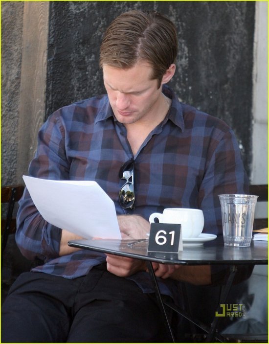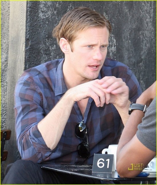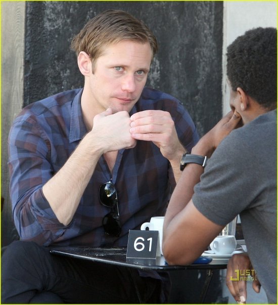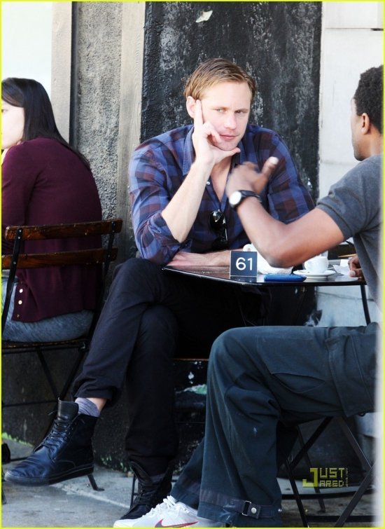Александра Скарсгарда папарацци заловили в тот момент, когда звезда «Настоящей крови» и «Поколения убийц» посиживал с темнокожим незнакомцем, видимо, приятелем, в ресторане Joan’s on Third в Западном Голливуде. Самый сексуальный мужчина Швеции загадочно смотрел в никуда, вертел в пальцах номерок столика, изучал бумажку формата А4, немного общался со своим визави и единожды улыбнулся так лучезарно, что ваша покорная слуга растаяла:)).