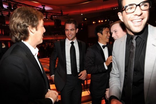 Сэр Пол, Крис Пайн, Джон Чо, Антон Ельчин, Закари и композитор Майкл Джиаччино