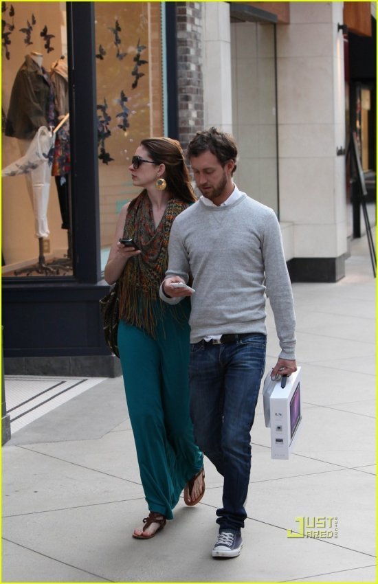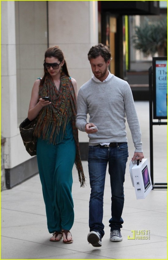 Энн Хатауэй и ее нового бойфренда Адама Шульмана папарацци заловили в тот момент, когда парочка прогуливалась по улицам Лос-Анжелеса, выйдя из магазина Apple в Лос-Анжелесе. MacBook вот, судя по всему, прикупили. Но объятья и поцелуи интересней любых компьютеров, а имеено этим наши герои и занимались:)