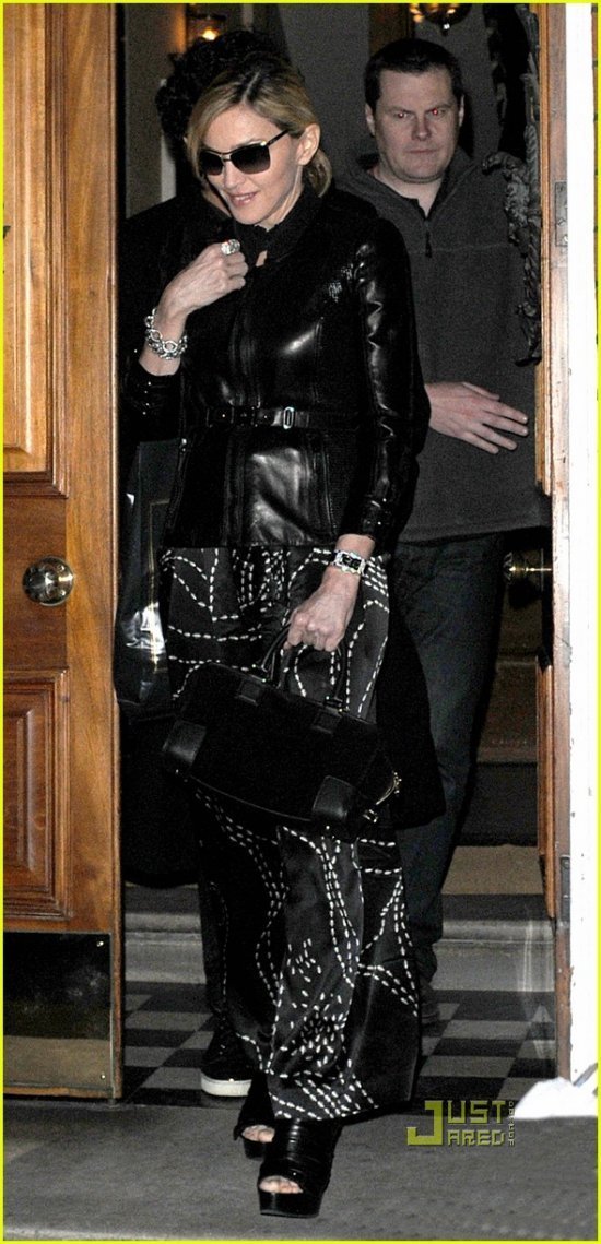 Мадонна, которая нынче находится в Лондоне, решила созвать своих друзей — Хесуса Луса, Гвинет Пэлтроу, модельеров Валентино и Стеллу Маккартни — на обед. Вся компания собралась в одном из ресторанов Челси. Что там да как прошло внутри — не знаем, потому что папарацци, естественно, никто туда не пустил, зато можем угадать, что еда была вкусная: выходя, наши герои сыто и счастливо улыбались. Только вот одеты все были не по весеннему черно-мрачно. Сговорились, что ли? Или само так вышло? Надеюсь, что Стелла, которую фотографы в кадр не поймали, нарядилась повеселее.