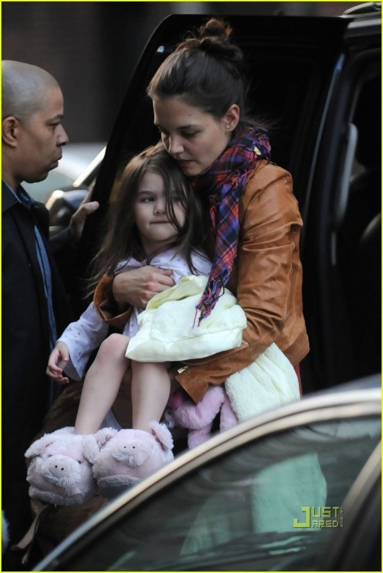 И вот мама с дщерью предоставили нам возможность полюбоваться на домашнюю Сури. Фотографы застукали девчонок вчера вечером в Нью-Йорке. Сури была — удивительное дело! — в огромных тапочках-свинках и пижаме.