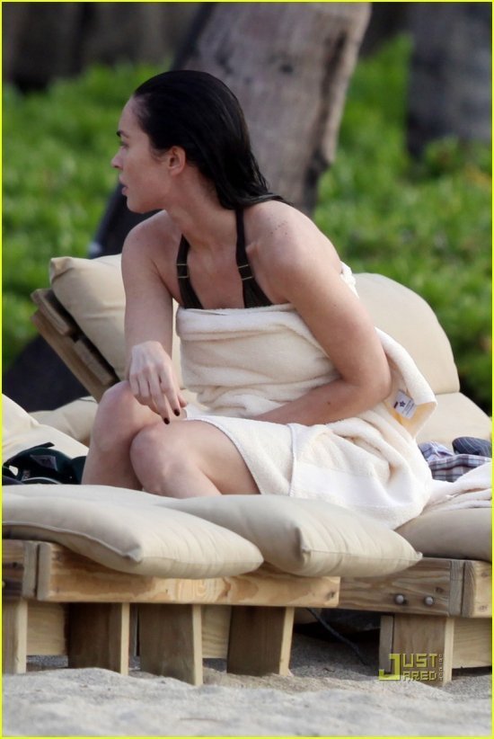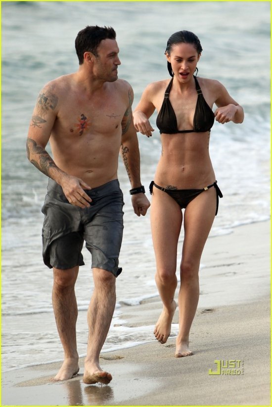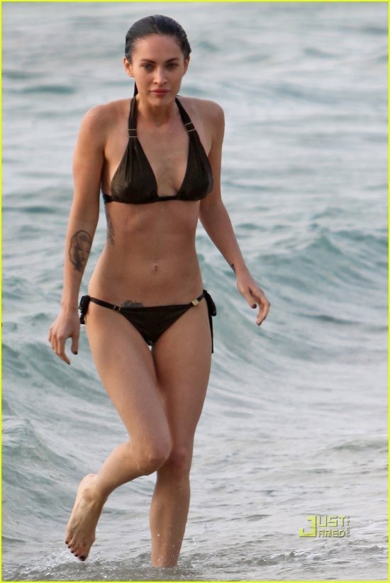 Меган Фокс папарацци отловили на Мауи, Гавайи. Непохоже, чтобы актриса сильно переживала о том, что ее не будет в третьих «Трансформерах«: заглядываем под кат, и смотрим, как красотка резвится в воде вместе со своим бойфрендом Брайаном Остином Грином, и заодно ищем недостатки в ее фигуре. Я обнаружила два: животик у Меган все-таки малость выпирает, что видно на снимках сбоку, ну и мяска, пожалуй, маловато на груди — ребрышки торчат:)