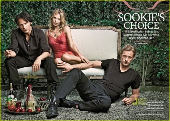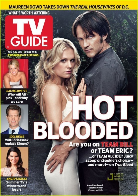 Журнал TV Guide опубликовал роскошную фотосессию главных героев сериала «Настоящая кровь». Анна Пакуин появляется на двух обложках — со Стивном Мойером на одной и с Александром Скарсгардом на другой. Таким образом, журнал подчеркивает дилемму ее героини Сьюки: кого же выбрать — вампира Билла или вампира Эрика? ))