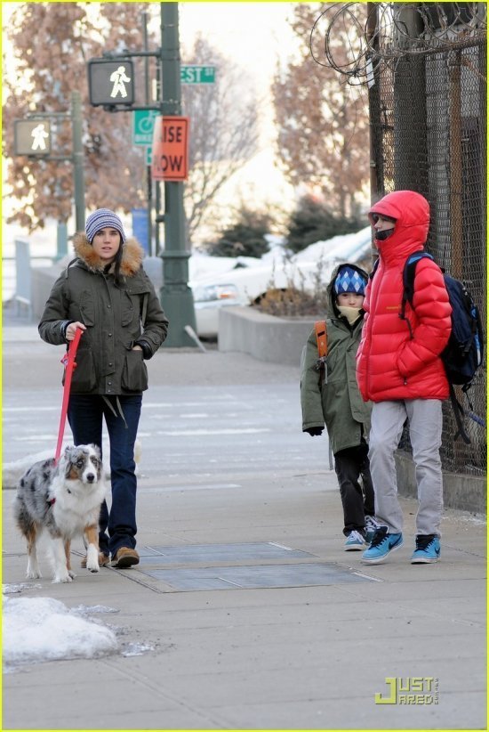 В Нью-Йорке нынче всхолоднуло, но, впрочем, не настолько, чтобы у детей отменили занятия в школе. Дженнифер Коннелли, собирая на учебу сыновей, заставила их укутаться самым основательным образом.