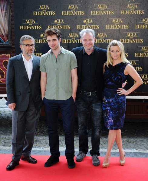 Мы с вами видели премьеру «Воды слонам!» в Барселоне, но там же актеры дали и пресс-конференцию, где тоже изрядно повеселили народ. Риз Уизерспун сменила откровенное черное платье на скромный темно-синий наряд, ну, а Роберт Паттинсон и вовсе вышел к фотографам по простому — в зеленой рубашечке, брючках и кедах. В тот день лил дождь, и перед фотоколлом Роб был в кожаной куртке и темных очках, блюдя образ Джеймса дина, а испанские девушки-сопровождающие радостно несли над ним зонтик. Не обошлось, конечно, без фирменных жестов и забавных рожиц — бегите заценивать их под кат!