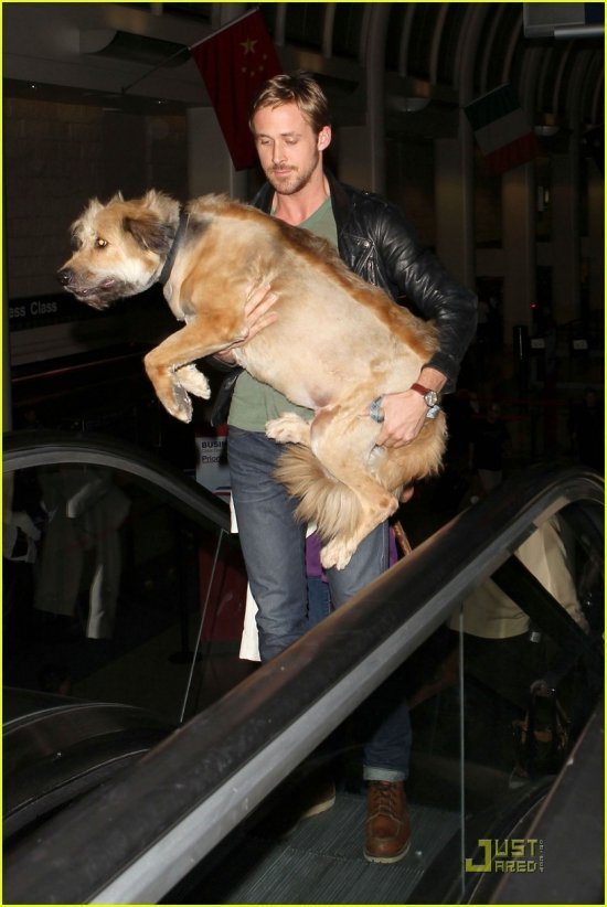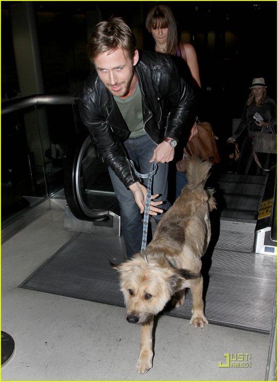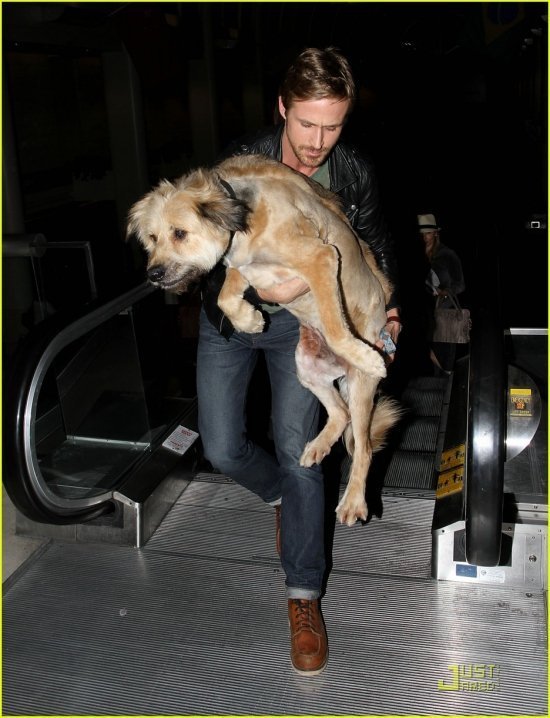 Райана Гослинга папарацци поймали в аэропорту Лос-Анжелеса: парень собрался куда-то лететь, да не один, а в обществе лохматого друга — пса Джорджа.