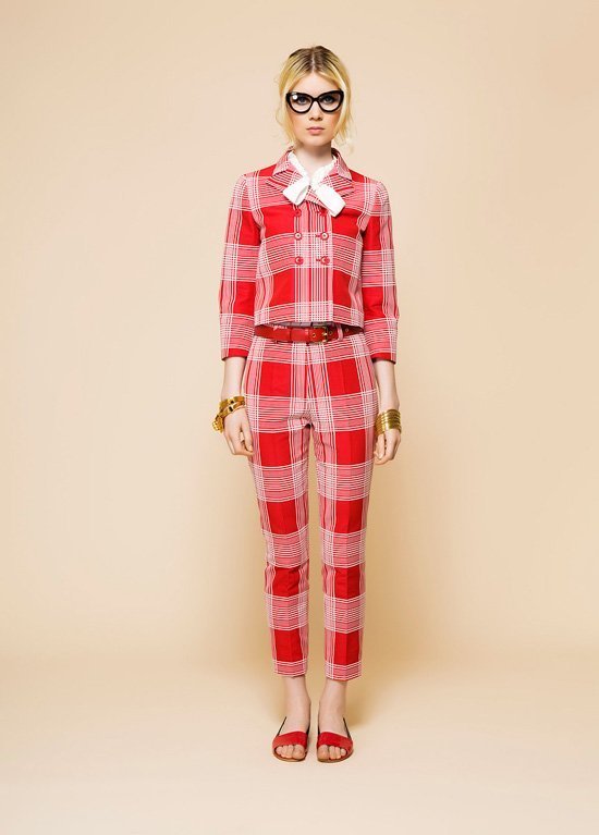 Вообще, блестящие в смысле моды шестидесятые прослеживаются, пожалуй, во всей коллекции. Юбки-пузыри, брюки-капри, графичность рисунков, банты на и сверху жакетов, и, как завершение, очки забавной, но столь популярной тогда, формы.