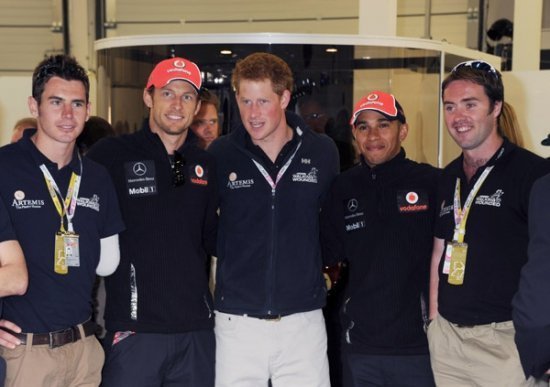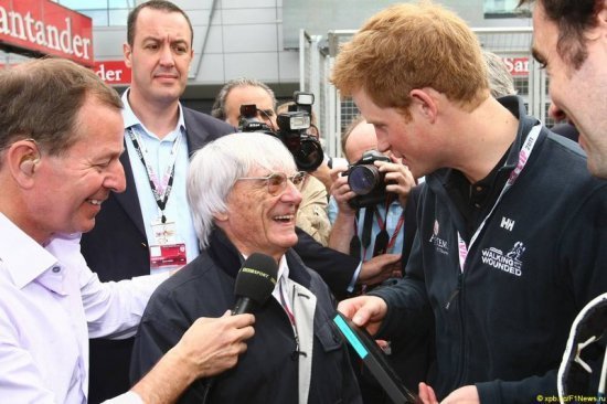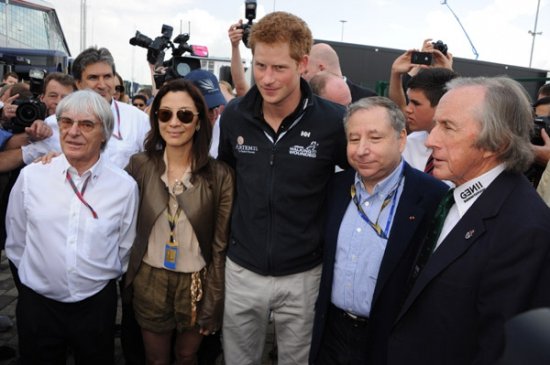 Гарри с боссом королевской Формулы Берни Экклстоуном, Жаном Тодтом, бывшим спортивным директором Феррари и главой FIA, его супружницей Мишель Йео и Джеки Стюартом