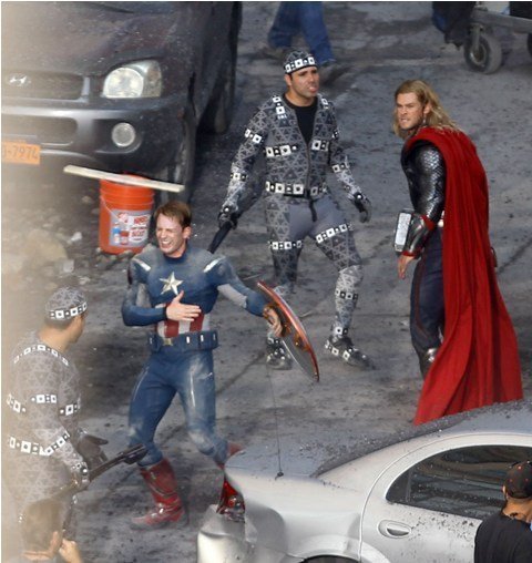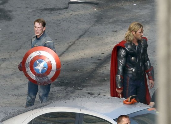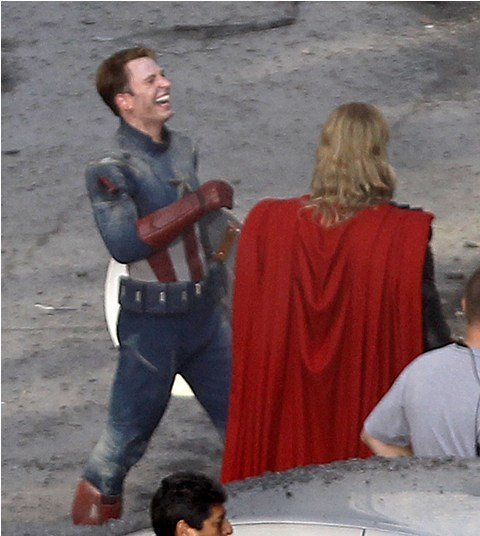Мы с вами уже видели, как Крис Эванс снимается в «Мстителях» в роли Капитана Америка. На днях папарацци засняли, как к нему присоединился другой Крис — Хемсворт, который играет в картине бога Тора. Дело было в Кливленде, парочка снималась в одной очень горячей экшен-сцене с участием дублеров и статистов в датчиках — и последнее, видимо, жестоко «раскололо» парней. Ржали бедняги, как сумасшедшие ))) И я понимаю их! ))