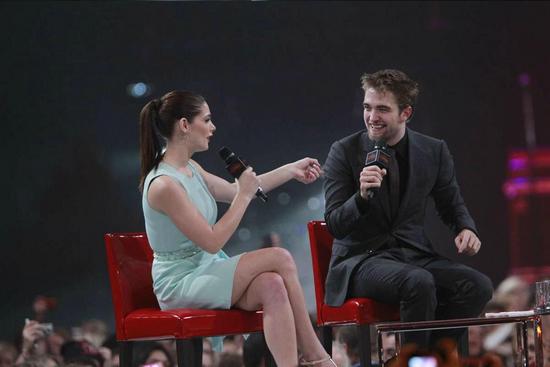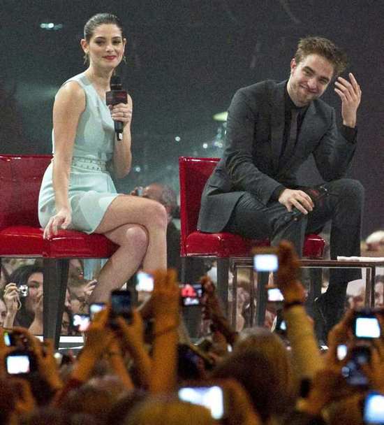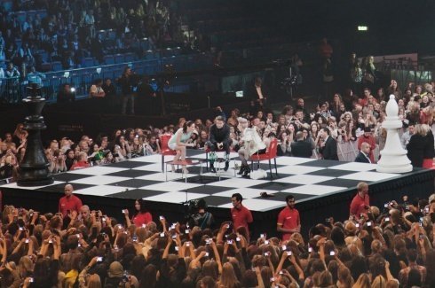 На минувших выходных Роберт Паттинсон и Эшли Грин заехали в Стокгольм на фанатский конвент по «Рассвету» — то есть не просто представили публике фильм, но и отвечали на их вопросы. Собрали целый стадион, где восседали в центре на шахматной доске. Судя по фото, общаться парочке гораздо комфортнее и веселее, чем позировать вместе…