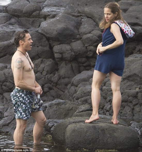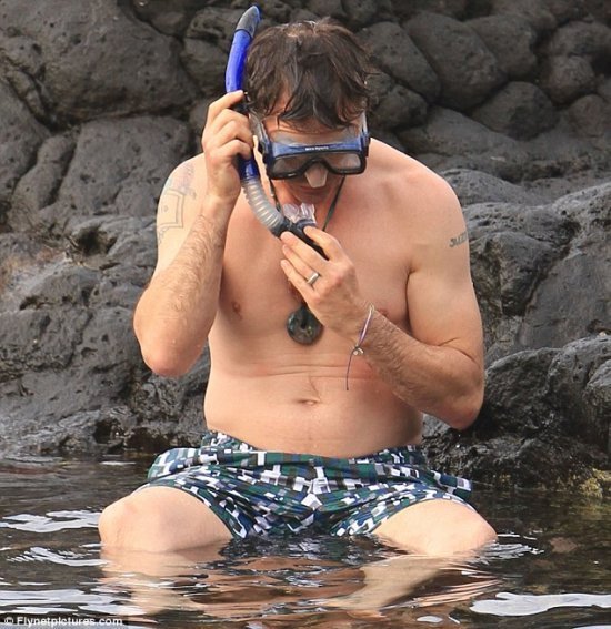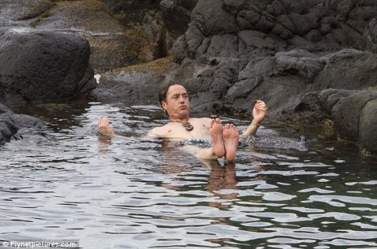 На днях мы с вами наблюдали, как Роберт Дауни с супругой Сьюзен гуляет по пляжу. Нынче давайте смотреть, как наш любимец затеял заплыв в небольшой бухточке, которую в пору бы назвать лягушатником. Понятно, почему он не решился на более рискованное предприятие: не хотел надолго оставлять в одиночестве беременную супругу.