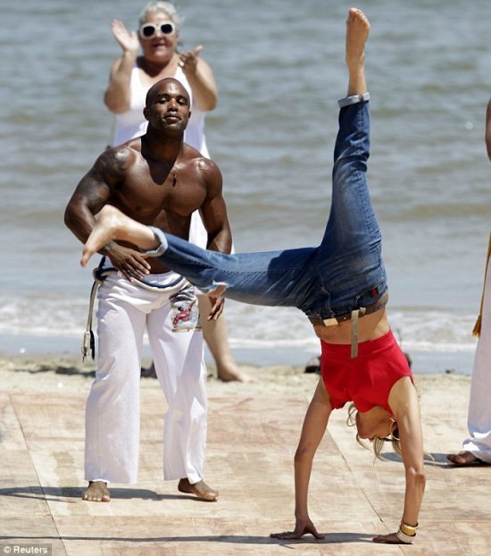 На пляже Плайя де лос Инглесес в Монтевидео звезде демонстрировали свое искусство капоэйристы (капоэйра, напомним, это борьба, сочетающая в себе элементы танца, акробатики и игры, и сопровождающаяся национальной музыкой. Ноу-хау бразильское, но занимаются им во всем мире).