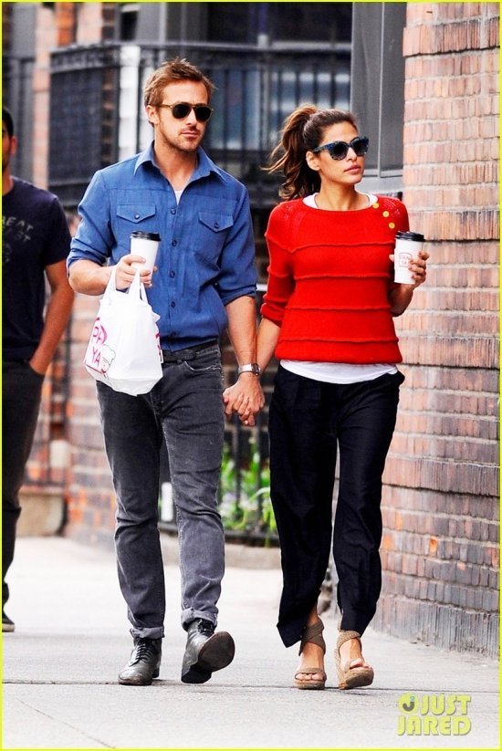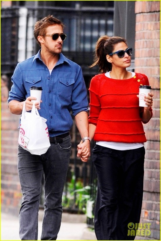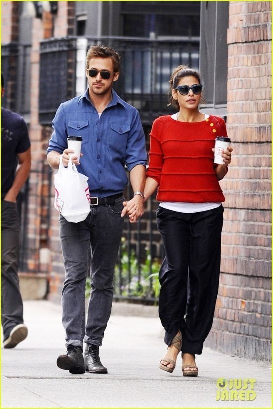 Райан Гослинг и «подруга дней его суровых» Ева Мендес попались папарацци в Нью-Йорке аккурат после приобретения кофе и каких-то вкусняшек (сквозь пакет не разглядеть:) в булочной-кондитерской Panya. Все, как видим, у пары хорошо: вон как цепко держатся за руки.