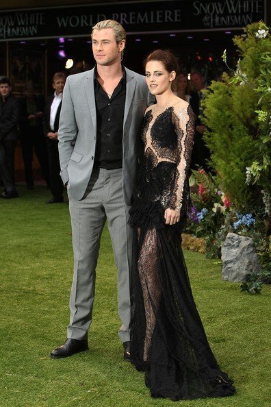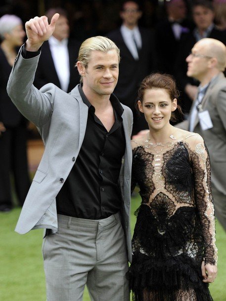 Формат «при параде» вообще не ее, но тут Стюарт просто пугает своим внешним видом: платье ужасно на смотрится, макияж неудачный, и прическа туда же. Да еще, как обычно, сутулится. Терон прекрасна и величественна, хотя прозрачная юбка у такого платья немного не в тему. А Хемсворт однозначно бог, аж дух захватывает 😆