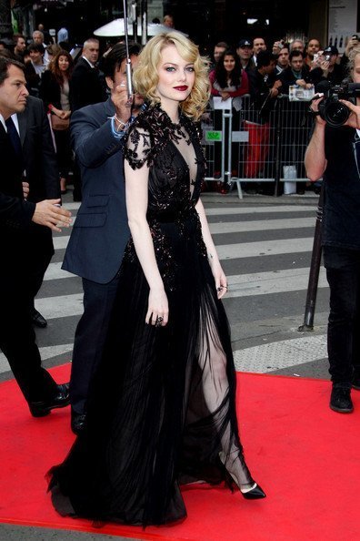 Эмма Стоун предстала перед публикой в одном из лучших своих образов: роскошная блондинка в длинном черном платье с трендом «прозрачность» от Gucci, в туфлях Christian Louboutin, драгоценностях Repossi и с клатчем от Cartier. Выглядела сногсшибательно! Эндрю Гарфилд тоже принарядился — в красный костюмчик от Balenciaga под цвет эмминой помады. От кого и во что был одет Рис Ифанс, не сообщается, увы )))