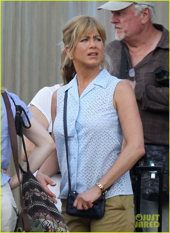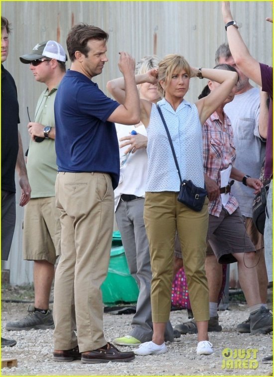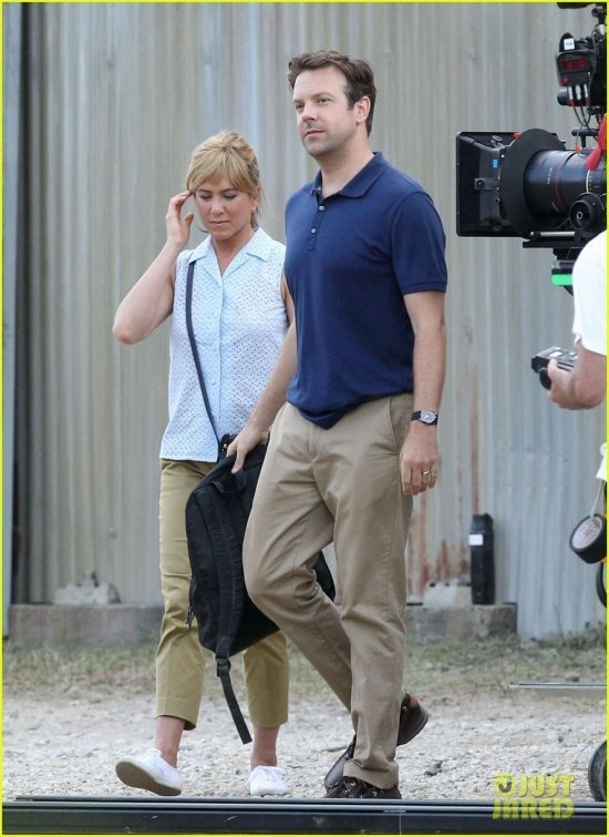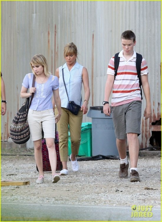 Дженнифер, Эмма и Джейсон на съемках «Миллеров»