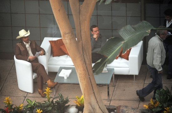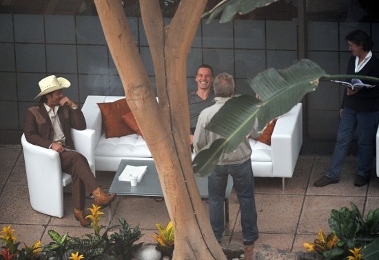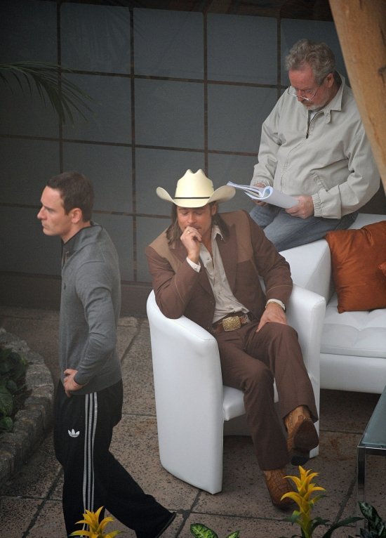 Вчера мы с вами видели только Брэда Питта в ковбойской шляпе, а теперь можем полюбоваться еще и на режиссера, и Майкла Фассбендера. Последний щеголял по площадке то в строгом костюме с галстуком, то в трениках с лампасами.