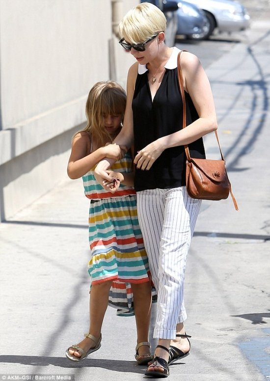 Мишель Уильямс с дочкой Матильдой и бойфрендом Джейсоном Сигелом были отловлены папарацци в тот момент, когда шли в театр Pantages в Лос-Анжелесе, чтобы посмотреть «Белоснежку«.