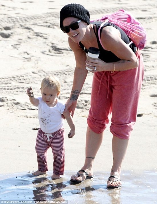 Пинк вместе с 15-месячной дочкой Уиллоу папарацци подкараулили на пляже в Венисе, Калифорния. Певица отлично подготовилась к пляжному отдыху: лопаточки, ведерко, даже грабли — все необходимое взяла!-)