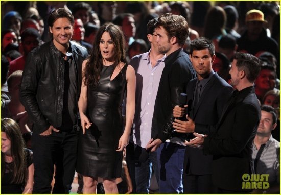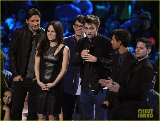На церемонии вручения премий MTV Video Music Awards звезды «Сумеречной саги» представили тизер 2 части «Рассвета«. Из очевидного: треугольник Эдвард — Белла — Джейкоб потерял одну из своих вершин, ибо Кристен Стюарт, как и ожидалось, не появилась. Ее можно понять: испугалась, видимо, что ее порвут, и, что самое обидное, отнюдь не на сувениры.