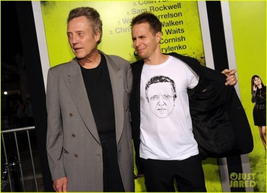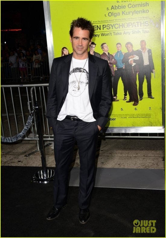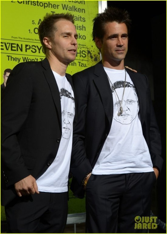 В ролях заняты Колин Фаррел, Сэм Рокуэлл, Кристофер Уокен, Том Уэйтс, Эбби Корниш, Вуди Харрельсон и Ольга Куриленко. Все они, за исключением последних двух, блистали вчера на красной дорожке в Вествуде. Особенно отличились Колян и Семен: парни надели одинаковые футболки с изображением Кристофера Уокена. Порадовали мужика, молодцы!-)