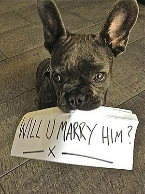 Далее, собственно, предложение. Романтик Овейн сделал его дома: выложил лепестками роз (500 штук, ни много ни мало) дорожку, обрамленную зажженными свечами. Но пошел по этой дорожке не сам: эту миссию взял на себя его любимец — французский бульдог Кэш. Научить его говорить Овейну, естественно, не удалось, поэтому пес держал в зубах табличку с надписью: «Выйдешь за него?»