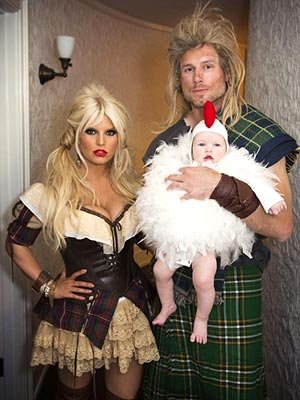 Жених звезды Эрик Джонсон стал Храбрым сердцем Уильямом Уолласом, а вот кого изображала сама Джессика, сказать затрудняемся. На жену горца, согласитесь, этот легкомысленный наряд не тянет, несмотря на наличие клетки-) Зато совершенно очевидно, кем была шестимесячная дочка пары Максвелл Дрю — ей на ее первом в жизни Хэллоуине досталась ответственная роль цыпленка-)