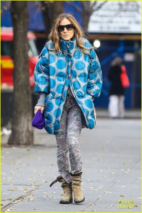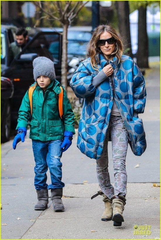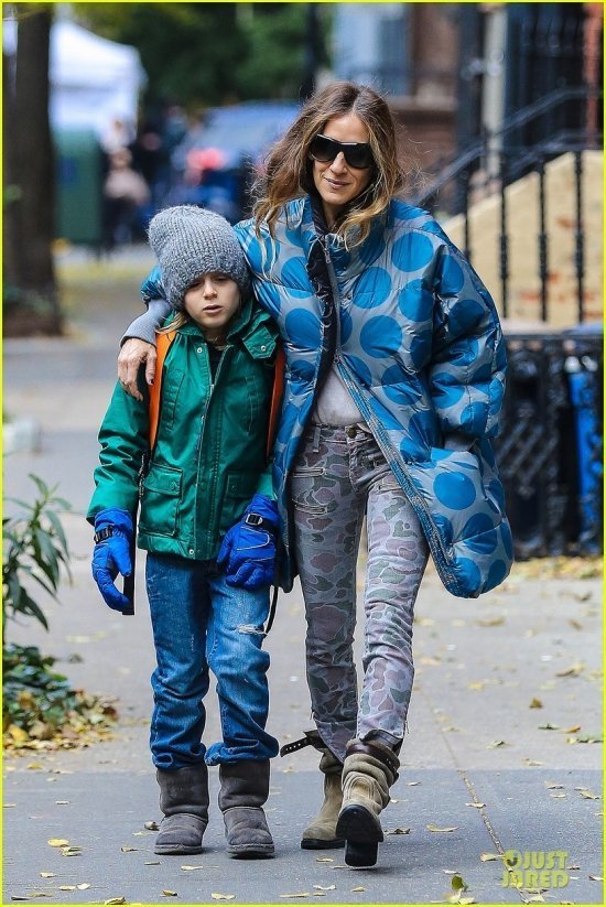 Сара Джессика Паркер, определенно, затеяла что-то революционное в сфере ношения штанов с сапогами — актриса никак не желает заправлять брючины в обувь, и мы подозреваем, что это она неспроста!-) На сей раз папарацци отловили звезду за повседневными делами: сначала она отвела в школу сына Джеймса Уилки, а затем вместе с няней покатила на прогулку дочек Марион и Табиту.