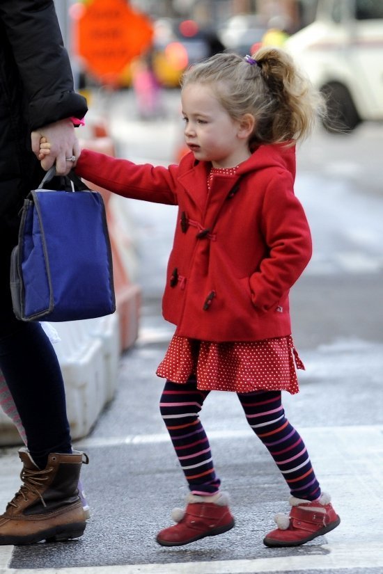 Малышек засняли в стильных и ярких даффлкотах на прогулке с няней, а на следующий день к компании присоединилась и мама — в драных джинсах, что мы уже на ней видели (похоже, это все-таки не колготы под ними, а второй слой-), которые она по-прежнему отказывается заправлять в сапоги-)