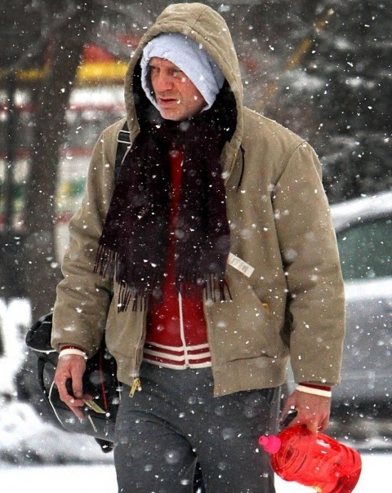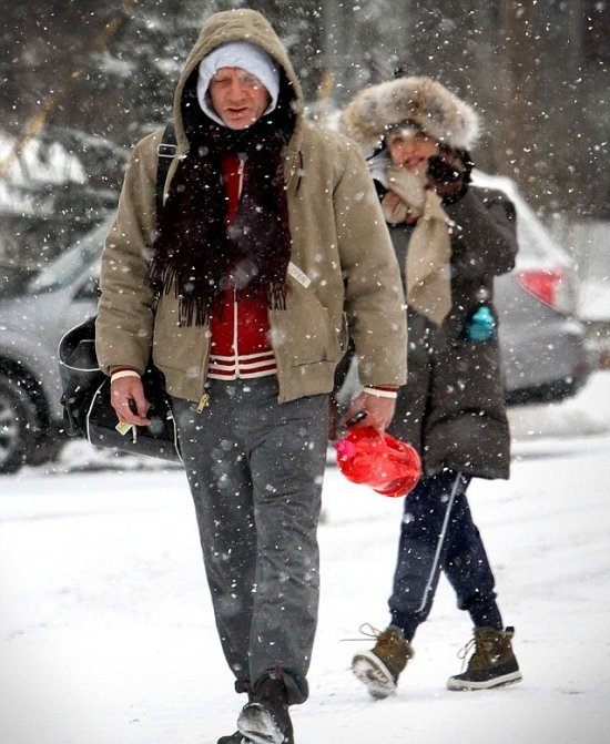 Дэниел Крэйг и Рейчел Уайз попались в объективы папарацци в заснеженном Нью-Йорке. Пара вышагивала в сторону спортзала, одетая соответственно погоде. Однако если Рейчел выглядела очень даже мило — практически Снегурочка, если б не спортивные штаны-) — то Дэниел, признаться, более всего походил на драпающего из Москвы наполеоновского солдата, или же немца под Сталинградом в 1943 году…