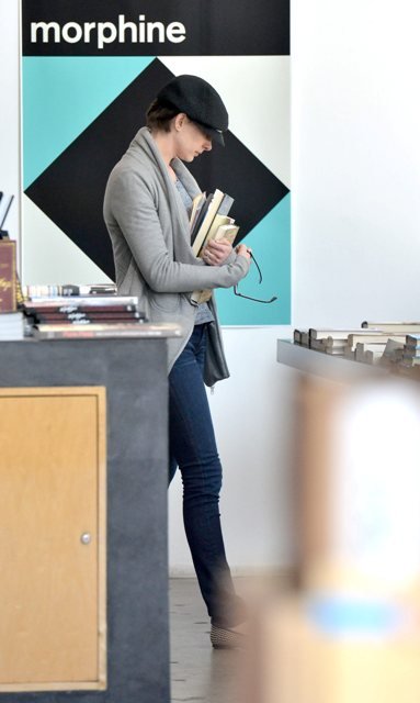 Энн Хэтэуэй вы не увидите ползающей под столами в клубе — по этой части у нас есть Линдсей Лохан. Аннушку зато легко можно встретить в книжном магазине — вот как на днях, к примеру, это посчастливилось папарацци.