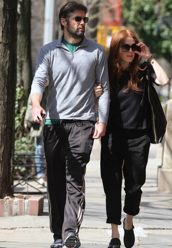 Джулианна Мур попалась в объективы папарацци на прогулке в Нью-Йорке. Актриса, облаченная в мешковатые штаны черного цвета, сабо и футболку (т.е одетая более чем casual) гордо вышагивала под руку с мужем Бартом Фройндлихом. Потом супруг куда-то запропастился, что ввергло Джулианну в крайнюю задумчивость. Заключаем это на основании высунутого звездного язычка и почесывания рыжей головы-)