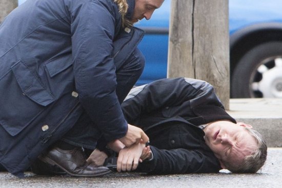 Итак, в финале 2 сезона Шерлок прыгнул с крыши госпиталя Сент-Барт. Ватсон видел все своими глазами и о ужаса упал в обморок. Но, судя по нынешним фото и сплетням, Шерлок прибег к двух уловкам: дублеру и гипнозу. С крыши спрыгнул сильно похожий на него человек, которого ассистенты Холмса тут же утащили как мертвого. А некто из толпы схватил Ватсона якобы в знак поддержки и прибег к гипнозу — эту роль сыграл прославленный иллюзионист Деррен Браун. Как именно все произошло, мы узнаем уже из самого сериала.