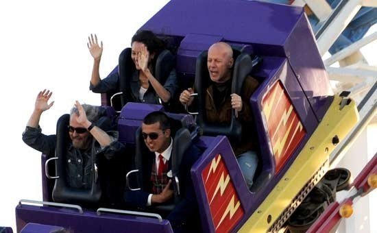 На днях «с горочки спустился» сам крепкий орех Брюс Уиллис с женой Эммой — и получил, судя по картинке, массу удовольствия. Репортеры TMZ подсуетились, поскребли по сусекам и представили на суд общественности снимки других звезд, сделанные также на американских горках.