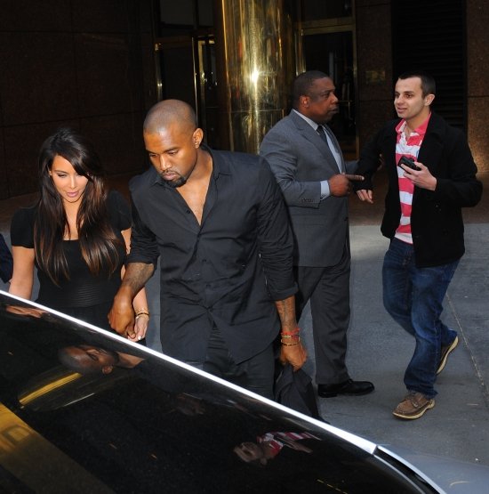 Заглядываем под кат и находим там бойфренда Ким Канье Уэста и ее саму, разъезжающих по делам в Нью-Йорке.
